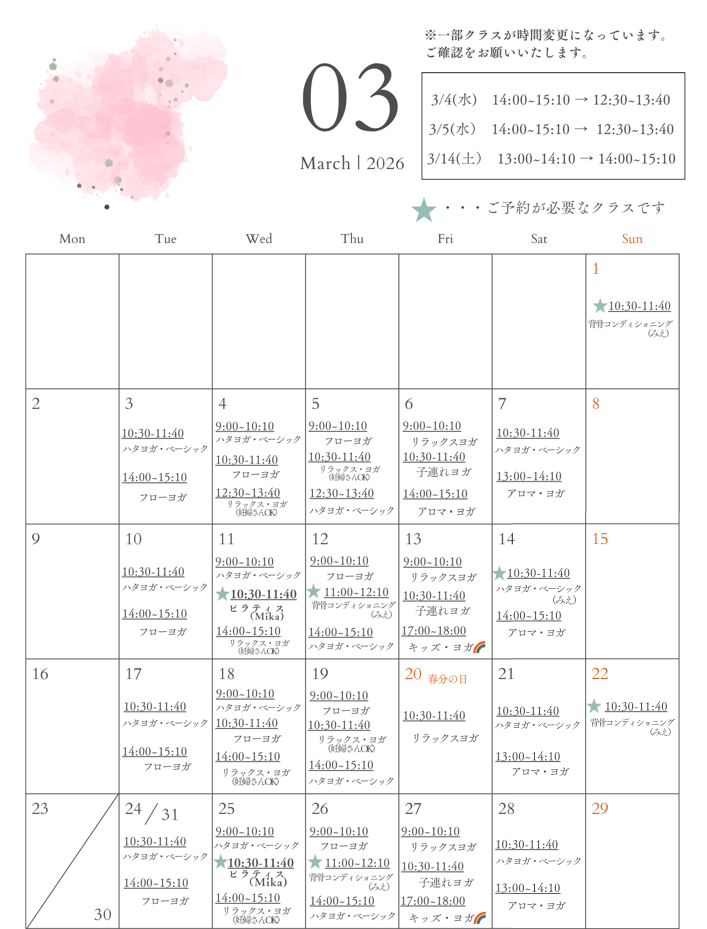 3月は下記クラスの開始時間が変更となっております。