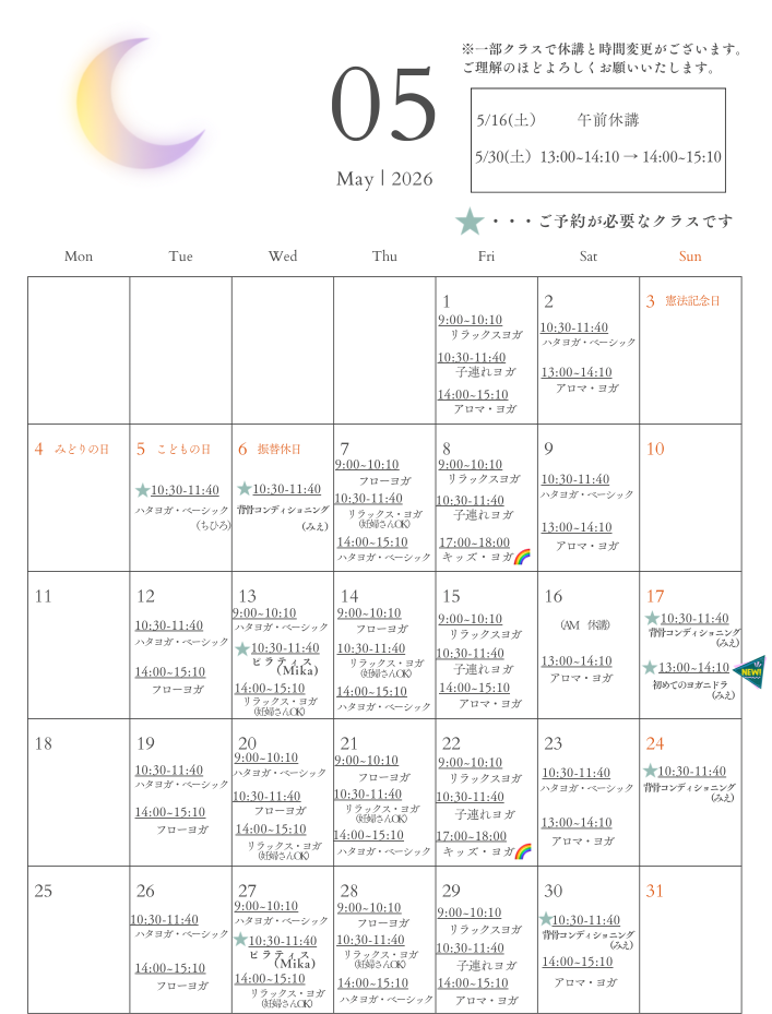 5月は下記クラスの休講及び開始時間が変更となっております。